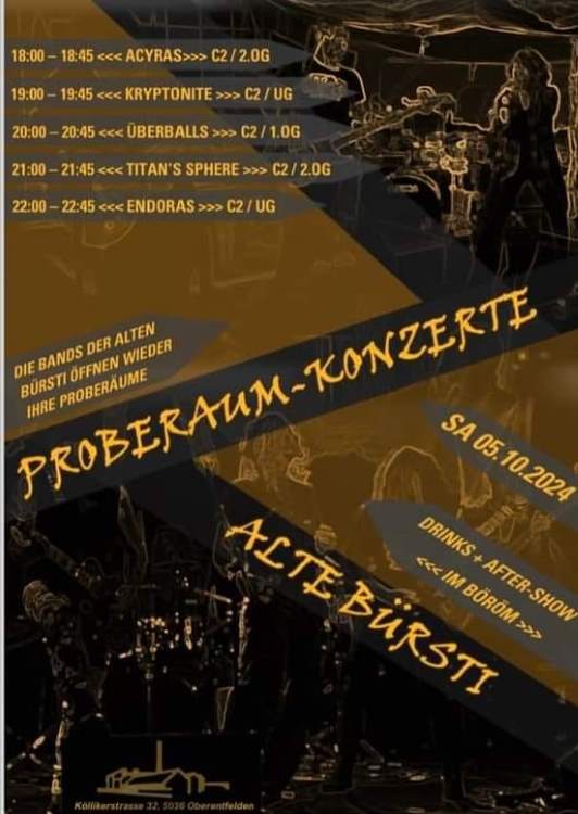 Bandraum Konzert Sa., 5 Oktober, 2024 Oberentfelden (AG) Alte Bürsti Endoras Acyras Überballs Kryptonite Titan’s Sphere