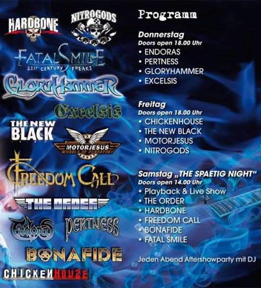 Ice Rock Festival Do., 2 Januar, 2014 20:00 Wasen im Emmental Endoras Pertness Gloryhammer Excelsis Chickenhouse The New Black Motorjesus Nitrogods The Order Fatal Smile Freedom Call Bonafide Hardbone